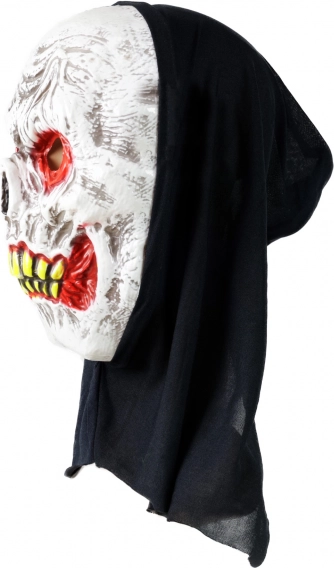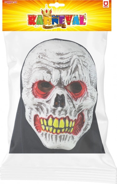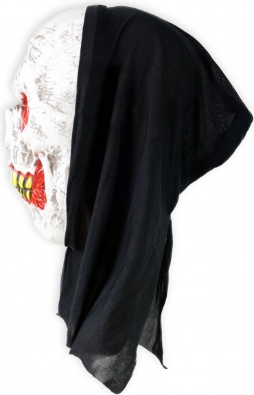 Denne kraniemaske med sort tørklæde/hætte forvandler dit kostume på et øjeblik. Det kontrastfulde hvide design med røde øjenkonturer og gule tænder fremhæver det skrækindjagende look, som ser fantastisk ud på fotos og i mørke under festlys.