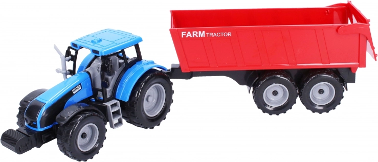 Traktor med anhænger 42 cm og svinghjul træk. To varianter: blå og rød. Ideel til små landmænd.