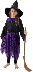 Forvandl din lille prinsesse til en mystisk heks. Kostumet i en elegant sort‑lilla kombination med markant flagermusmotiv er behageligt, let og dejligt at have på hele dagen. Hatten med sløjfe fuldender det autentiske look og understreger den magiske Halloween‑stemning eller festlige børnearrangementer.