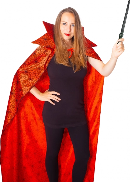 Stilfuld rød troldmandskappe med spindelvævsmotiv giver dit kostume til Halloween og karneval den helt rigtige effekt. Takket være den markante farve, den høje krave og det universelle snit er den ideel til troldmænd, hekse og magikere. Let materiale, dramatisk look og øjeblikkelig forvandling til en mystisk figur.