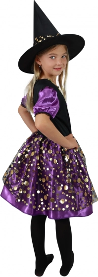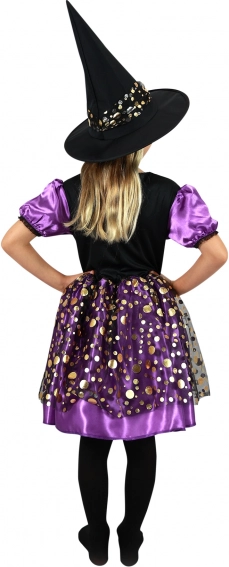 Forvandl din pige til stjernen ved enhver Halloween eller fastelavn. Den elegante lilla-sorte kjole med gyldne prikker og diskrete detaljer tager sig fortryllende ud på billeder og dansegulvet. Med den matchende spidse hat er outfittet komplet på få øjeblikke.