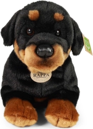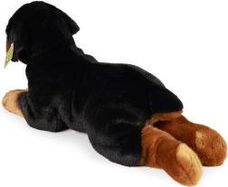 Denne detaljerede plysdyr-rottweiler tilbyder den perfekte kombination af blødhed, kvalitet og bæredygtighed. Den flotte sort-brune farve og den realistiske liggende position gør den til en skøn krammeven og en smuk dekoration på børneværelset. Håndsyet udførelse garanterer et præcist udseende og lang holdbarhed.