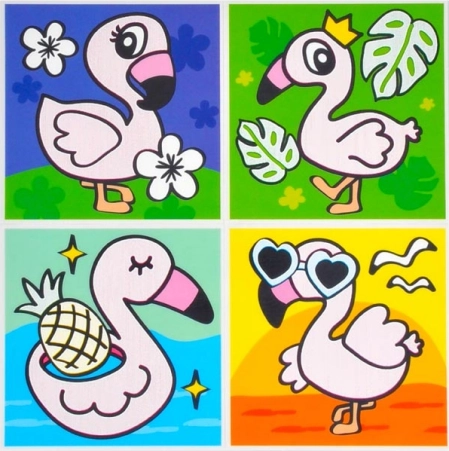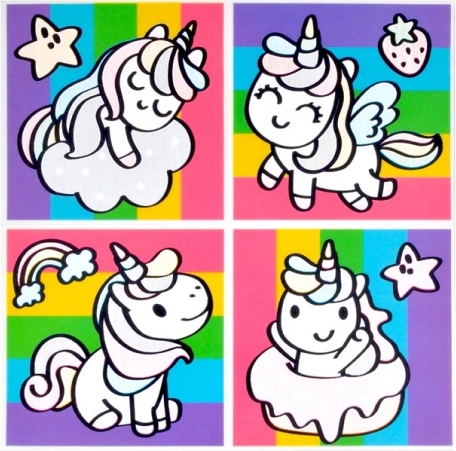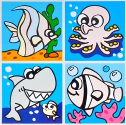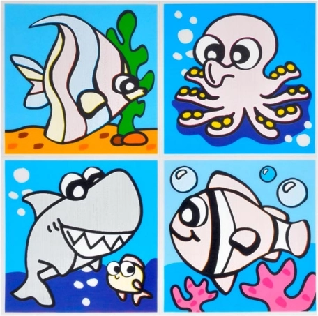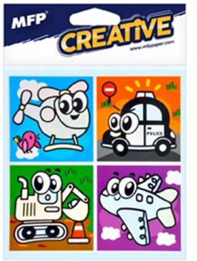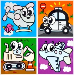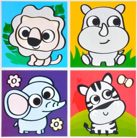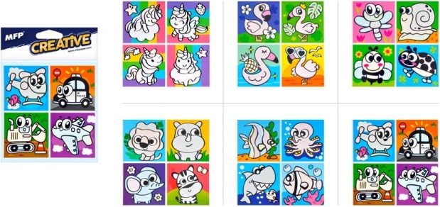 I pakken finder du en blanding af motiver, inklusive dyr og transportmidler. Hvert ark indeholder fire billeder, som passer perfekt til børnebadeværelset.