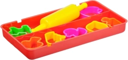 Pakken indeholder 7 enkeltpakkede farver modellervoks (lyserød, orange, gul, rød, grøn, blå, lilla), så der kan skabes markante og holdbare kreationer. De farverige plastikforme og den lette kagerulle er tilpasset børnehænder.