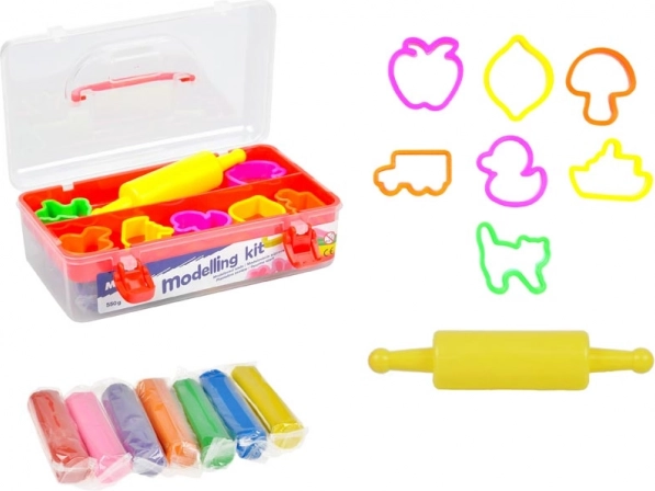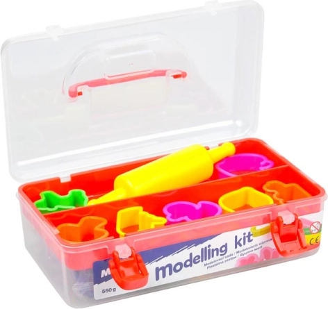 Dette farverige modelærsæt er ideelt til kreativ leg derhjemme og til førskoleaktiviteter. Børn kan udstikke, udrulle og forme forskellige motiver ved hjælp af de medfølgende forme og kagerulle. Den praktiske gennemsigtige kuffert holder alle dele samlet og gør transporten enkel.