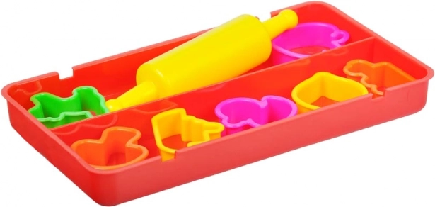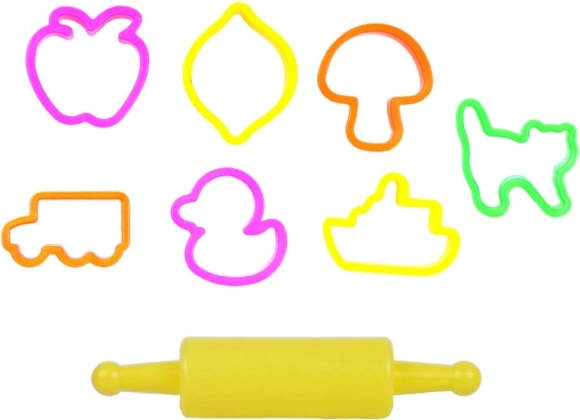 Sættet indeholder farverige plastikforme i forskellige figurer samt en let gul kagerulle, så børn nemt kan udrulle og udstikke flotte motiver.