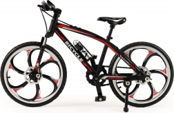 Opdag en detaljeret mini mountainbike i elegant sort med røde accenter. Denne metalmodel med friløb på hjulene efterligner en rigtig cykel – fra stel og styr til de markante fælge. Perfekt som gave til cykelentusiaster eller som dekoration på bord eller hylde.