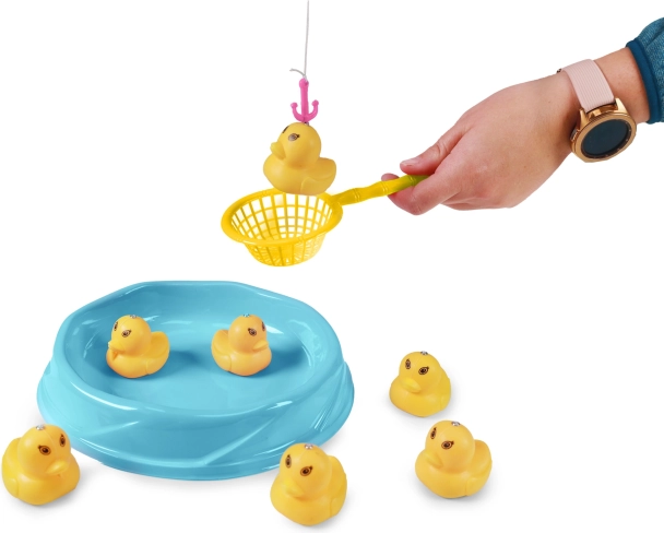 Underholdende vandleg for små lystfiskere med magnetisk fiskestang, plastik mini-dam og 6 søde ænder. Fyld beholderen med vand, læg ænderne i, og begynd at fange dem – nemt og sikkert takket være magneterne. Sjov leg, der styrker finmotorik og hånd-øje-koordination.
