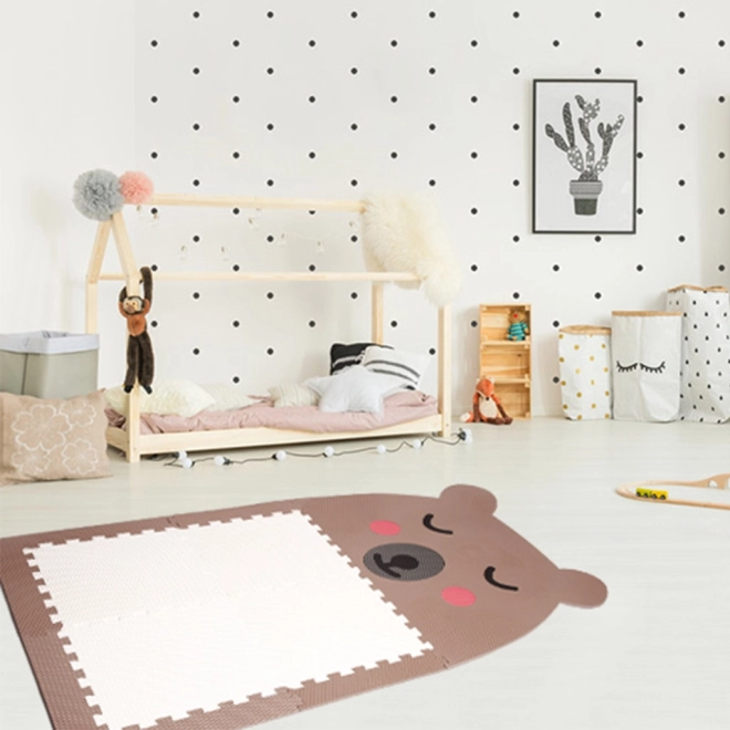 Designet puslespilsgulv i form af en bjørn i brun farve med hvid mave bringer sjov og hygge ind i børneværelset. Perfekt til børn at lege på og giver samtidig en behagelig og blød overflade. Let at vedligeholde og sikkerhed er nøglefunktioner ved dette produkt.