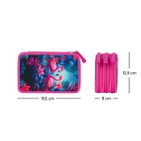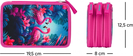 Pladsbesparende penalhus med tre adskilte rum og stilfuldt design med markante flamingoer, der fanger ethvert øje.