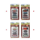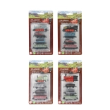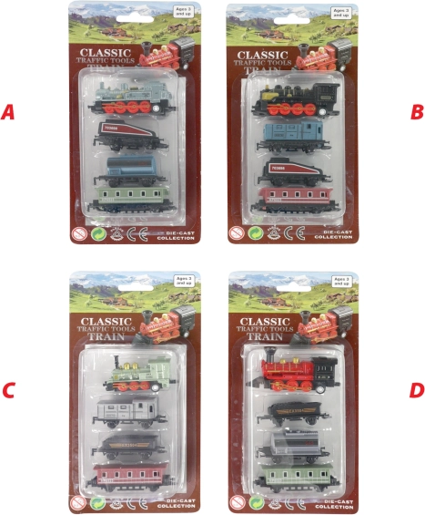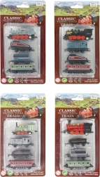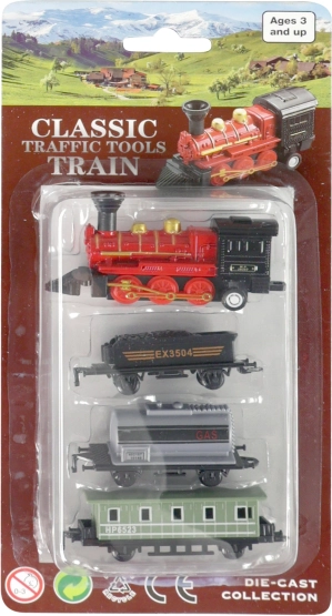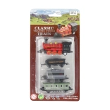 Sættet indeholder et metal-lokomotiv og tre plastvogne, ideelt til små samlere.