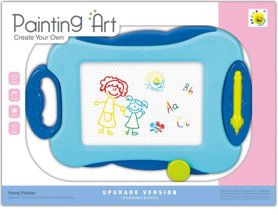 Denne magnetiske tegnetavle er et ideelt redskab for små kunstnere. Takket være den medfølgende magnetiske pen kan børn trygt og uden blæk eller farvekridt tegne efter egen fantasi. Ved at trække skydeviskeren hen over tavlen sletter du nemt og hurtigt tegningerne, og tavlen er straks klar til nye idéer.