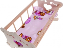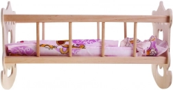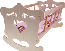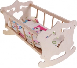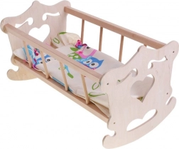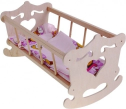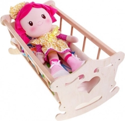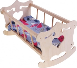 Trævugge til dukke med en maksimal højde på 50 cm med farverigt sengetøj vil passe til enhver lille mor.