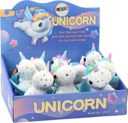 Træk-op plysunicorn: hopper og vifter med halen, blød hvid pels med sølvstjerner, blå vinger. CE, EN71. Til børn 3+.