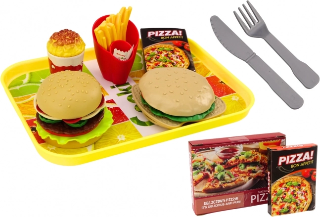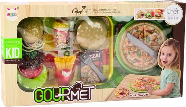 Dette realistiske sæt indeholder alt, hvad små kokke har brug for: pizza opdelt i fire stykker, to burgere med mulighed for fri sammensætning, pommes frites, popcorn og praktiske bestik med bakke. Børn kan lave deres egne kombinationer, træne hånd–øje-koordination og udvikle fantasien.