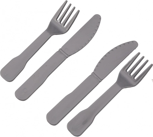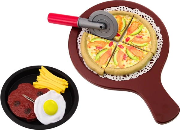- Pizza (4 stykker), pizzahjul, serveringsspade, pommes frites, bøf, æg, frugt, 2 is, 3 desserter, tallerken, skål, bakke, 2 gafler, 2 knive