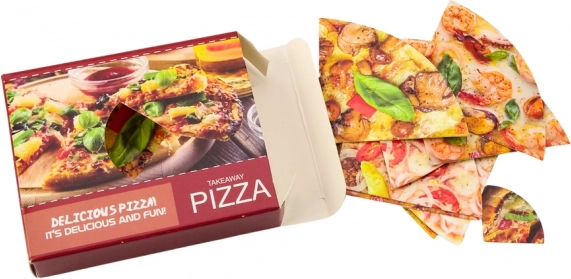 - Pakkens indhold: pizza (4 stykker) med pizzahjul og serveringsspade, pommes frites, bøf, æg, frugt, 2 is, 3 desserter, tallerken, skål, bakke, 2 gafler, 2 knive.