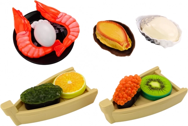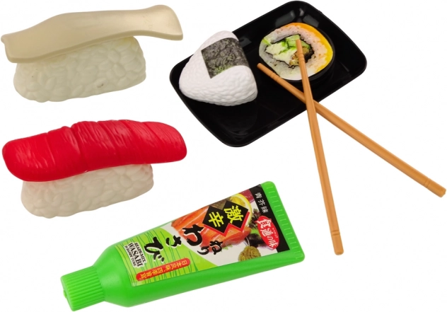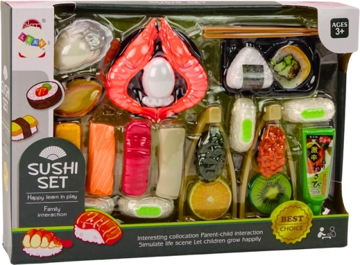 Et legetøjssæt til børn, der inviterer de mindste ind i den magiske verden af at tilberede og servere lækker sushi. Sættet indeholder forskellige ingredienser, der er nødvendige for at lave velsmagende sushi. Blandt dem er rejer, laks, wasabi, ris, nori-tang og spisepinde.
