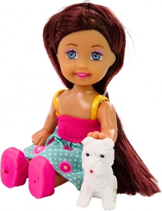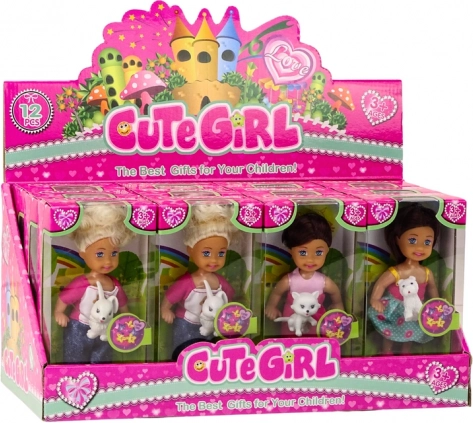 Sød mini-dukke med lille dyr, langt redbart hår og farverigt tøj. Kompakt størrelse, kvalitetsforarbejdning, CE- og EN71-certificeret. 3+.