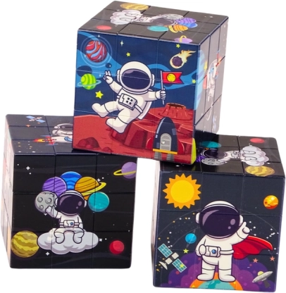 Den magiske terning er designet med glade farver og venlige illustrationer for at være fascinerende og underholdende for små astronomi-entusiaster. Børn skal samle et billede med motiver som astronauter og planeter, hvilket stimulerer deres kreativitet.