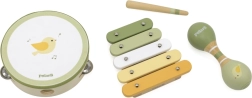 Sættet indeholder tamburin, xylofon og maracas, som giver børn mulighed for at eksperimentere med forskellige lyde og rytmer.