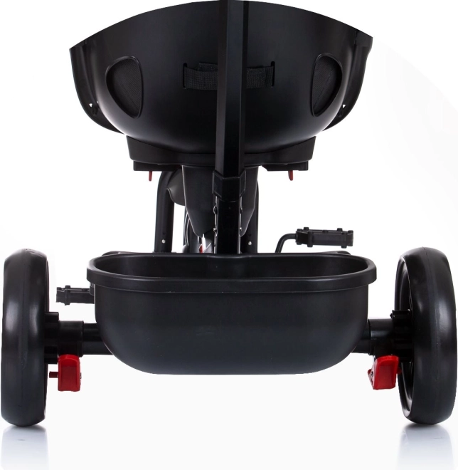 Gummihjul 10"/8", fodbremse, skærm og forskærm på forhjulet mod fastklemte fødder samt 3-punkts seler med bløde puder for rolige ture.