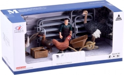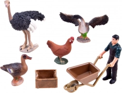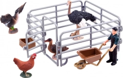I pakken finder du en markant struds, klassisk gårdfjerkræ – høne, gås og and, en bonde med trillebør samt indhegningsdele til at skabe din egen mini-gård. Takket være fleksibelt tilbehør kan man nemt opstille scener og udvide viden om husdyrhold.