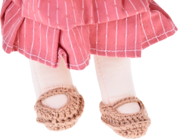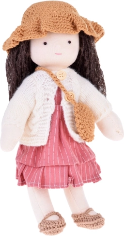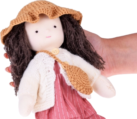 Dukken er klædt i rosa og beige nuancer: den har en stribet kjole, en strikket cardigan, en hat, matchende sko og en lille taske. Det lange, mørke hår og de omhyggeligt udførte detaljer giver dukken en unik charme. Den elegante papæske gør den til en smuk gave til både fødselsdag og jul.