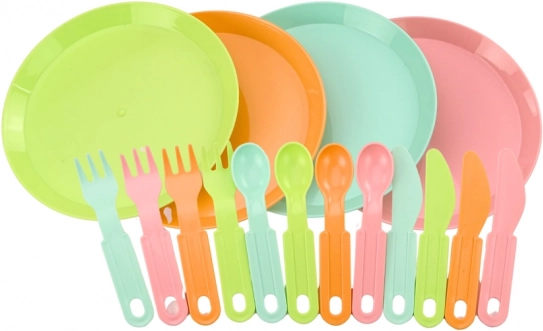 .Skærebræt nødvendigt til madforberedelse, sikkert for børn. Bestiksæt til 4 personer Indeholder gafler, knive og skeer, hvilket gør det muligt at „spise” måltidet sammen med venner eller familie. Fire farverige tallerkener, hvorpå man kan servere salater og frugt.