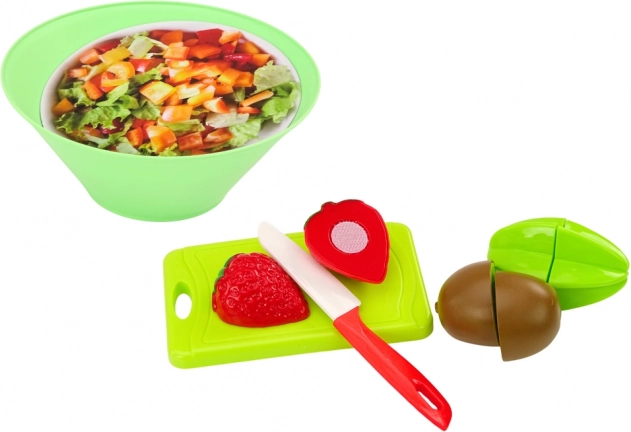 Legetøjssættet til at skære salater og frugt er et fremragende valg for børn, der elsker at lege med madlavning og madforberedelse. Sættet består af 25 dele. Den store bakke er rummelig og praktisk, ideel til servering af retter. Salatskålen fyldt med imitationer af frisk grøntsager opfordrer børn til leg og til at lære om sund ernæring.
