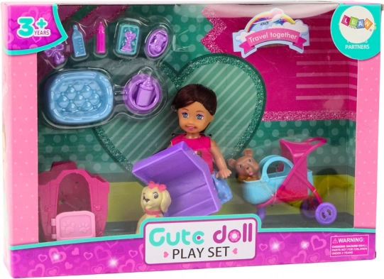 Dette farverige sæt indeholder en dukke med langt brunt hår i lyserød-blåt tøj, to søde hunde, en lyserød hundehytte, en vogn og en række tilbehør til daglig pleje. Med de mange scenarier træner børn ansvarlighed og udvikler kommunikationsevner.