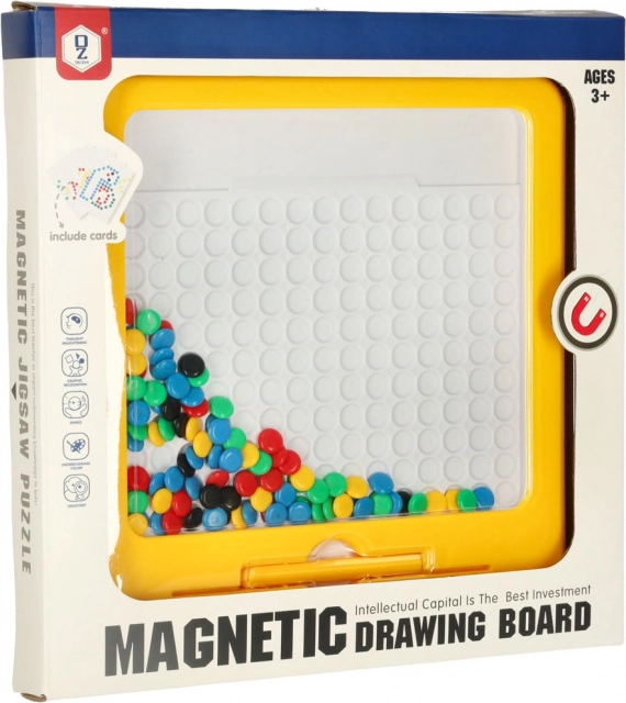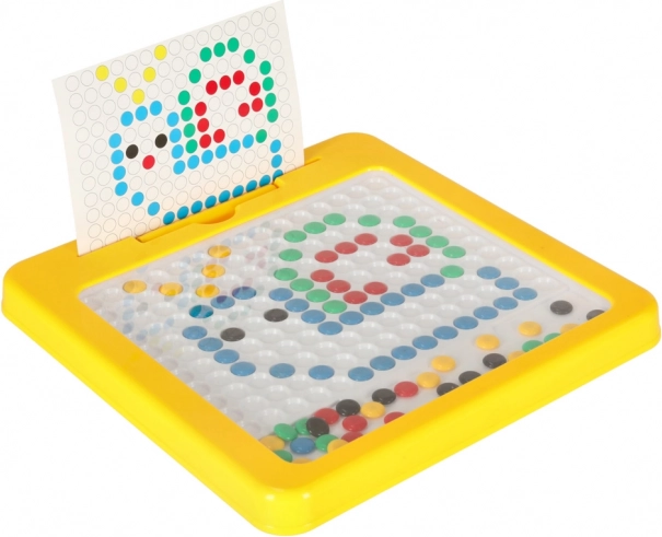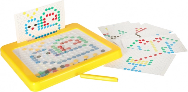 Den magnetiske tegnetavle med mosaik er et fremragende didaktisk hjælpemiddel inspireret af Montessori-principper. Med den magnetiske pen tiltrækker og flytter børn farvede “knapper” i pladen og sætter dem sammen til simple eller mere komplekse motiver. Medfølgende forlægskort gør det nemt at komme i gang og giver inspiration.