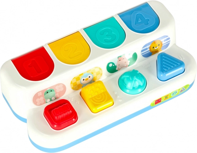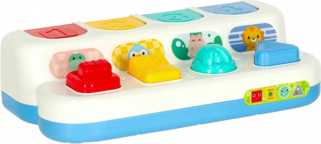 Denne interaktive pop‑up legetøj kombinerer læring med leg. Børn opdager farver, former og tal, samtidig med at de øver koncentration og logisk tænkning. Hvert panel har en anden mekanisme – tryk, skub eller drej – og efter den rigtige handling springer et sødt dyr op. Det karakteristiske “klik” understøtter hørelse.