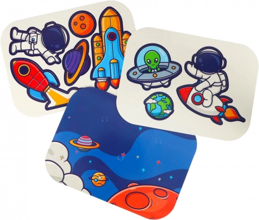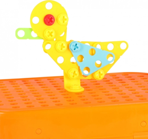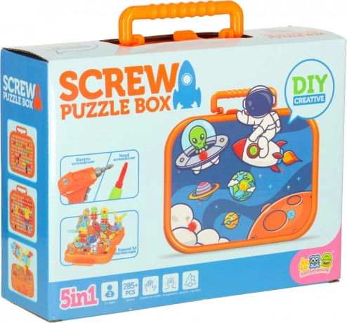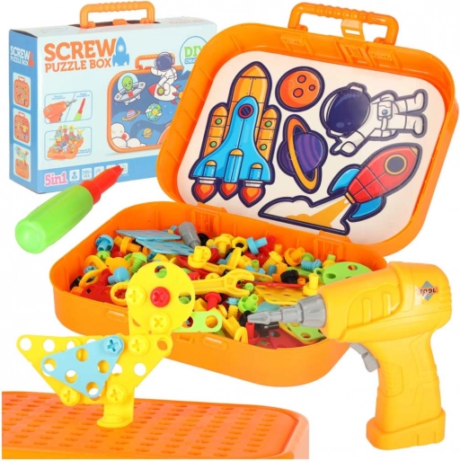 Opdag et sjovt og lærerigt legetøj til små konstruktører: en bærbar mosaik med elektrisk boremaskine og skruer. Børn træner deres finmotorik, kreativitet og logiske tænkning ved at bygge 2D- og 3D-modeller med kosmiske motiver. Den kompakte orange kuffert fungerer både som opbevaring og legeflade – perfekt til ture.