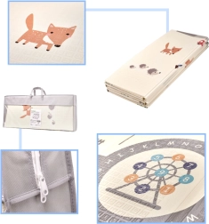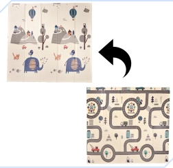 Denne dobbeltsidede måtte tilbyder to forskellige scenerier – på den ene side bakker og dyr, og på den anden side snoede gader til leg med små biler. En tykkelse på 1 cm sikrer komfort og beskyttelse mod kulde fra gulvet, hvilket er ideelt til at lære at gå på en sikker måde. Måtten er praktisk og let at folde sammen, hvilket gør den nem at opbevare. Produktet leveres i en taske med hanke.