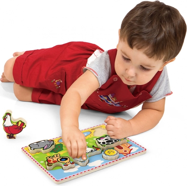 Farverigt indsætningspuslespil til børn med bondegårdstema indeholder seks dyr og understøtter udvikling af fantasi og hukommelse hos børn.