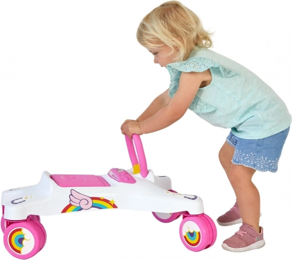 Den nuttede løbecykel med enhjørningemotiv er en skøn makker til daglig leg og træning af stabilitet. Takket være de 360° drejelige hjul kan den let dreje på stedet, og barnet kan glide igennem selv smallere passager. Den robuste plastkonstruktion giver støtte og tryghed, mens hornet tilfører sjov til kørslen.