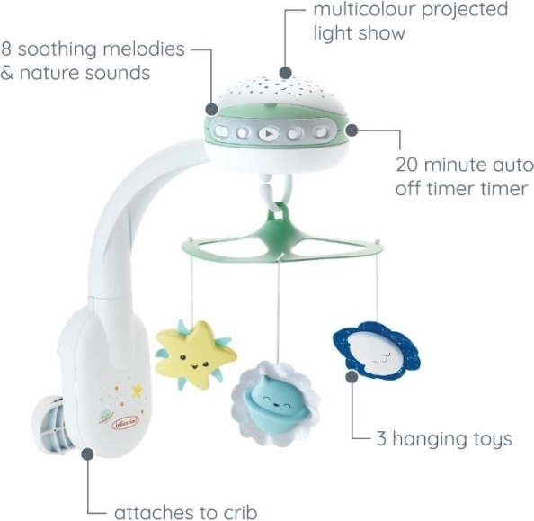 INFANTINO 3-i-1 uroen vokser med dit barn: fra en roterende sengemobil til projektor/lampe på tremmesengen og videre til en selvstændig natlampe på bordet. Den projicerer rolige stjernemønstre og tilbyder et udvalg af seks melodier og to naturlyde, som hjælper ved sengetid og skaber en behagelig aftenrutine.