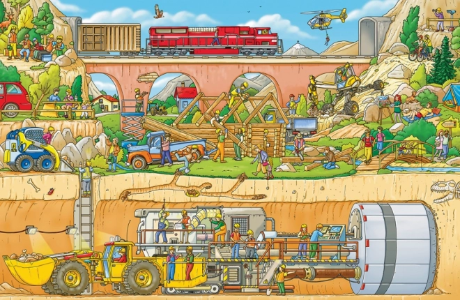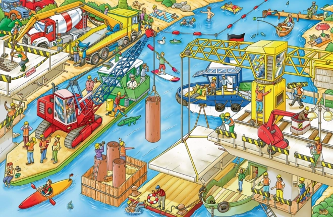 Bogen indeholder livligt illustrerede scener, der viser det pulserende miljø på en byggeplads med forskellige byggemaskiner.