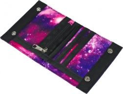 Praktisk studenterpung med galaxy-motiv, som byder på kompakte mål, sikker lukning med 2 trykknapper, møntlomme med lynlås og rum til kort og ID – alt overskueligt samlet ét sted.