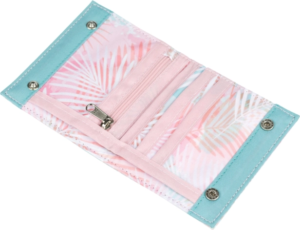 Stilfuld studerende pung BAAGL Sunset udmærker sig ved et kompakt design, overskuelig indvendig inddeling og slidstærkt tekstilmateriale. Den tilbyder lukning med 2 trykknapper, lynlåslomme til mønter og plads til sedler og kort. Det moderne tropiske motiv i pastelfarver understreger din stil perfekt.