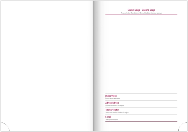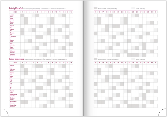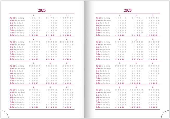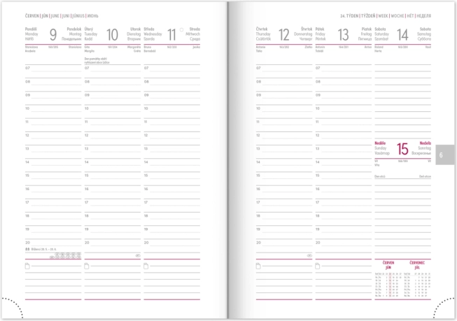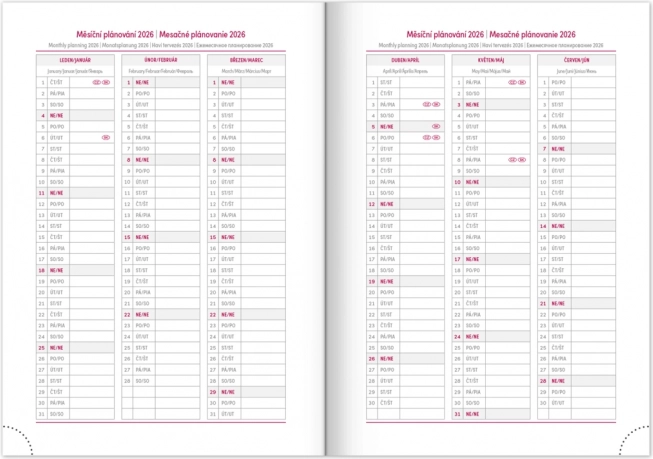 Det praktiske layout med ugeoversigt og tjekkisk-slovakisk kalendarium suppleret med engelsk, tysk, ungarsk og russisk sikrer perfekt overblik. Der medfølger månedlige og årlige planlægningskalendere, plads til noter samt nyttige kort og navnelister.