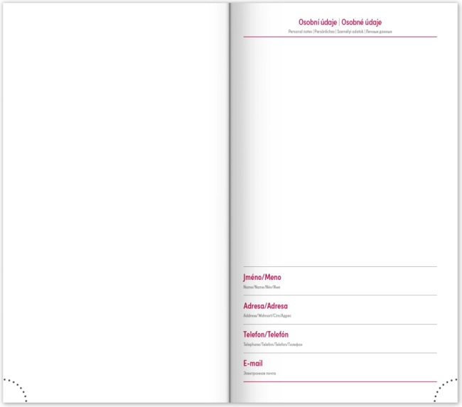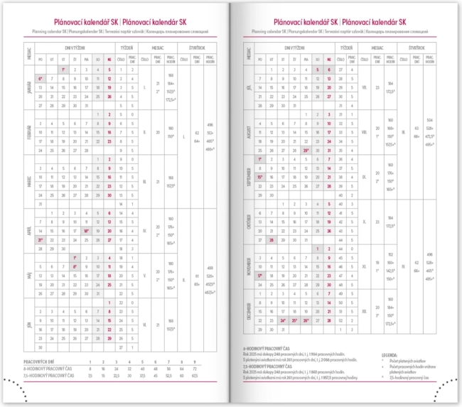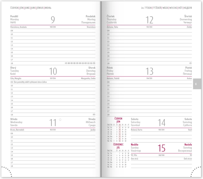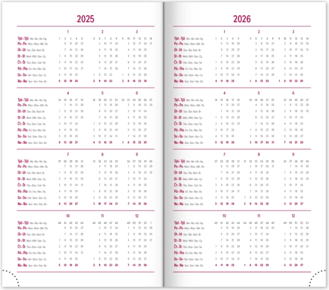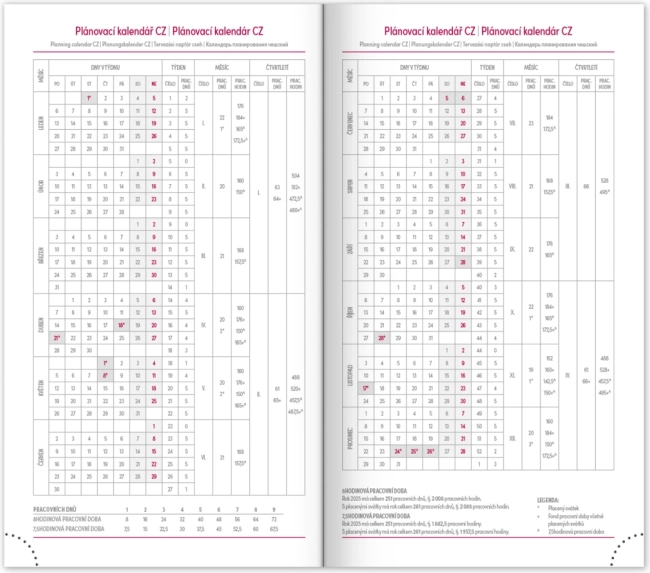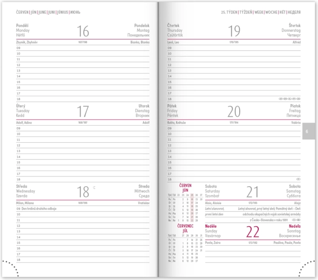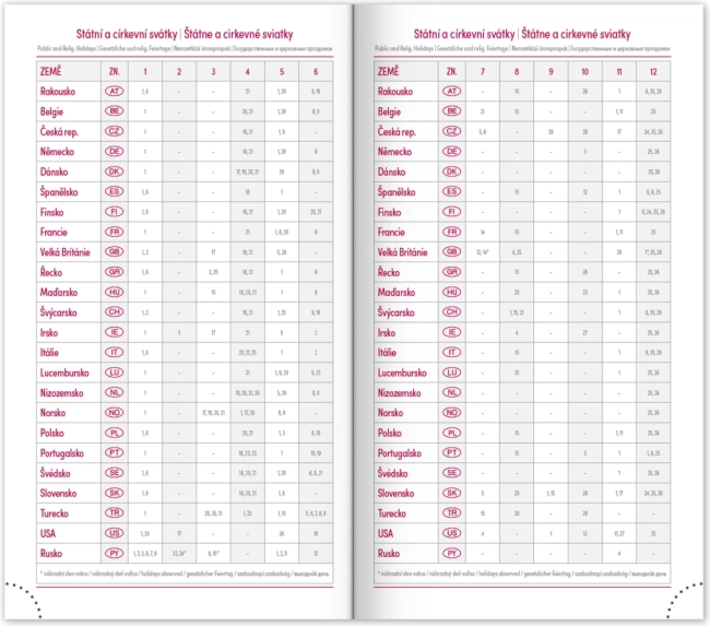 Ugentligt skema med kalender på tjekkisk og slovakisk, med tilføjelser på engelsk, tysk, ungarsk og russisk.</li>