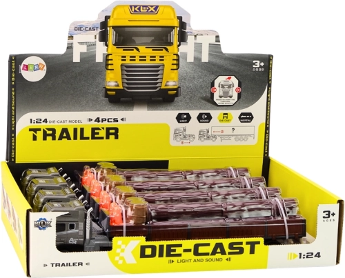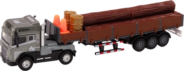 Realistisk lastbil med trailer i skala 1:24 imponerer med detaljeret udførelse og funktioner. Når kabinen trykkes ned, aktiveres lyseffekter og realistiske lyde af motorstart og bakning. Traileren er aftagelig og har aftagelige sider for nem lastning af træstammer. Der er også drift til selvkørende kørsel og tilbehør – kegler, tønder og træstammer.
