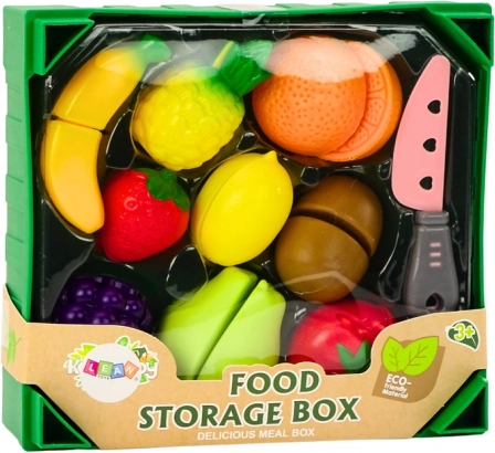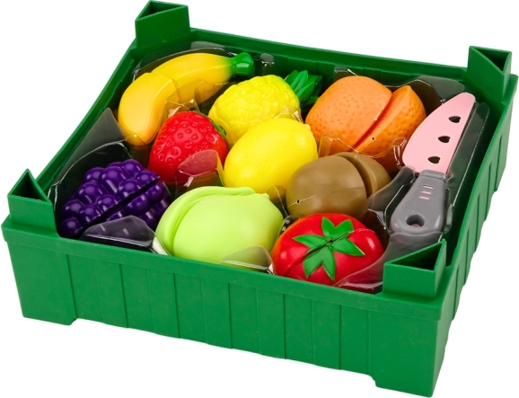 Den grønne kasse fungerer som praktisk opbevaring og lærer børn at holde orden efter leg. Realistiske former og farver på frugten hjælper med artsgenkendelse og understøtter sunde spisevaner gennem leg.