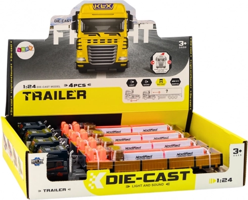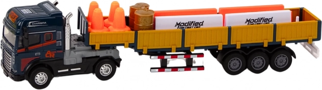 Dette blå lastvogntog med trailer i skala 1:24 efterligner trofast en ægte TIR-lastbil. Traileren har åbnbare sidedøre for let “lastning og losning”, og på ladet er der to tønder som last. Modellen er udstyret med lys og lyde af motorstart og bakning, hvilket øger spillets autenticitet.