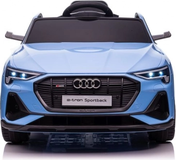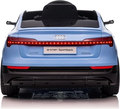 Den blå elektriske legebil til børn efter forbillede af AUDI e-tron Sportback imponerer med præcise detaljer som frontgrill med logo, realistiske lys og aerodynamiske linjer. Takket være det funktionelle rat og det komfortable sæde får børn en ægte følelse af at køre bil.