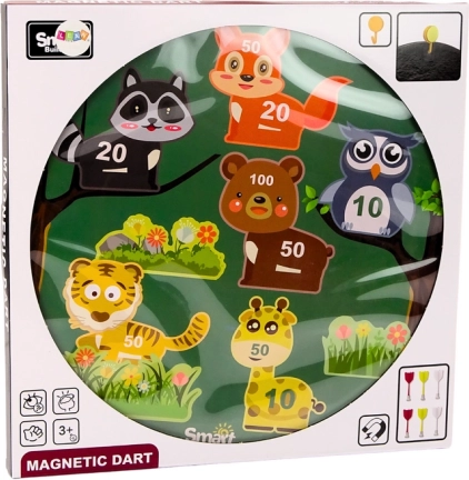 Dette magnetiske dartspil giver børn mange timers glædelig og sikker underholdning. Den farverige grønne skive er dekoreret med dyr (giraf, ræv, tiger m.fl.) med pointværdier, som motiverer til at forbedre resultaterne. Det magnetiske system eliminerer skarpe spidser, så spillet er egnet selv til yngre børn.