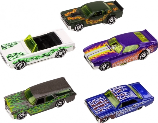 Sæt med metalbiler tilbyder en fantastisk kollektion af fem forskellige køretøjer, hvor hver har et unikt design med kraftige farver og dynamiske flammer, som giver dem et spændende udseende.