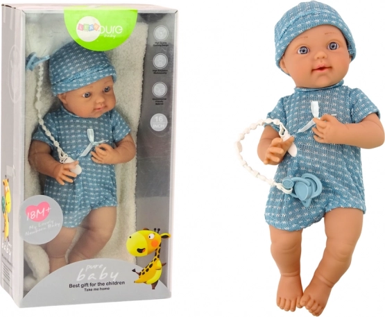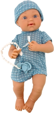 Babydukke i blå dragt med hue og sut giver børn mulighed for at fordybe sig i fantasiens verden, samtidig med at deres finmotorik og kreativitet udvikles takket være de bevægelige arme og ben.